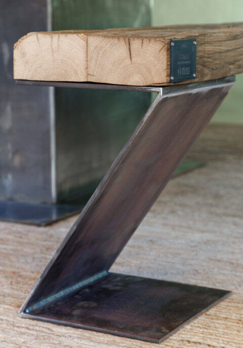 Banc intérieur, structure en poutres de chêne ancien et d'acier.